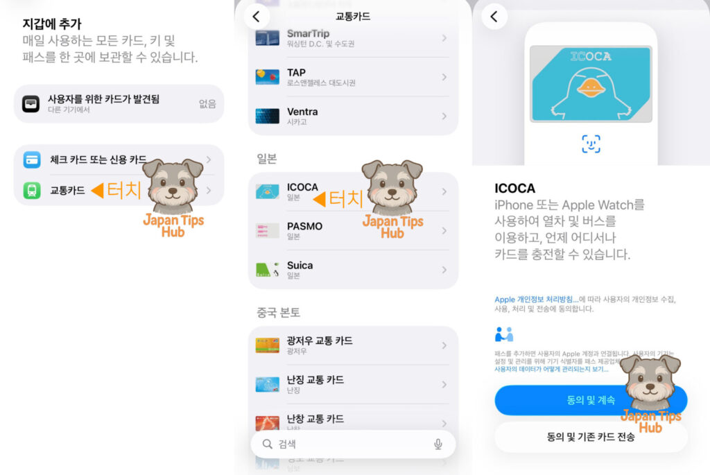 Apple 지갑 어플에 추가하면 터치만으로 승차도 쇼핑도 할 수 있어요. 이 경우엔 신용 카드를 이용한 충전도 가능합니다. Apple 지갑 어플을 열고 아래와 같이 몇 번의 터치만으로도 추가가 가능해요.